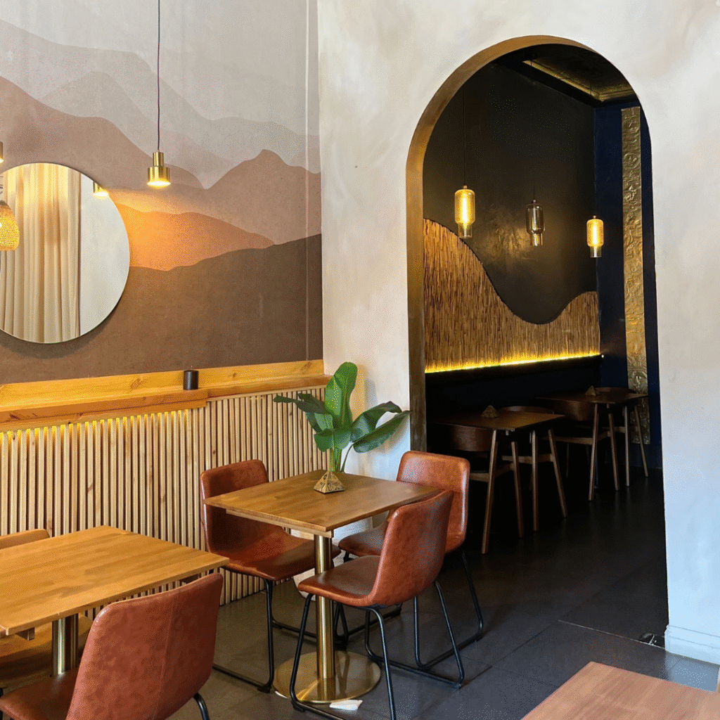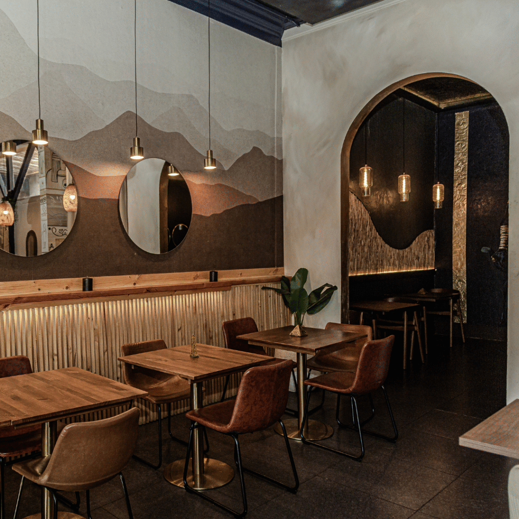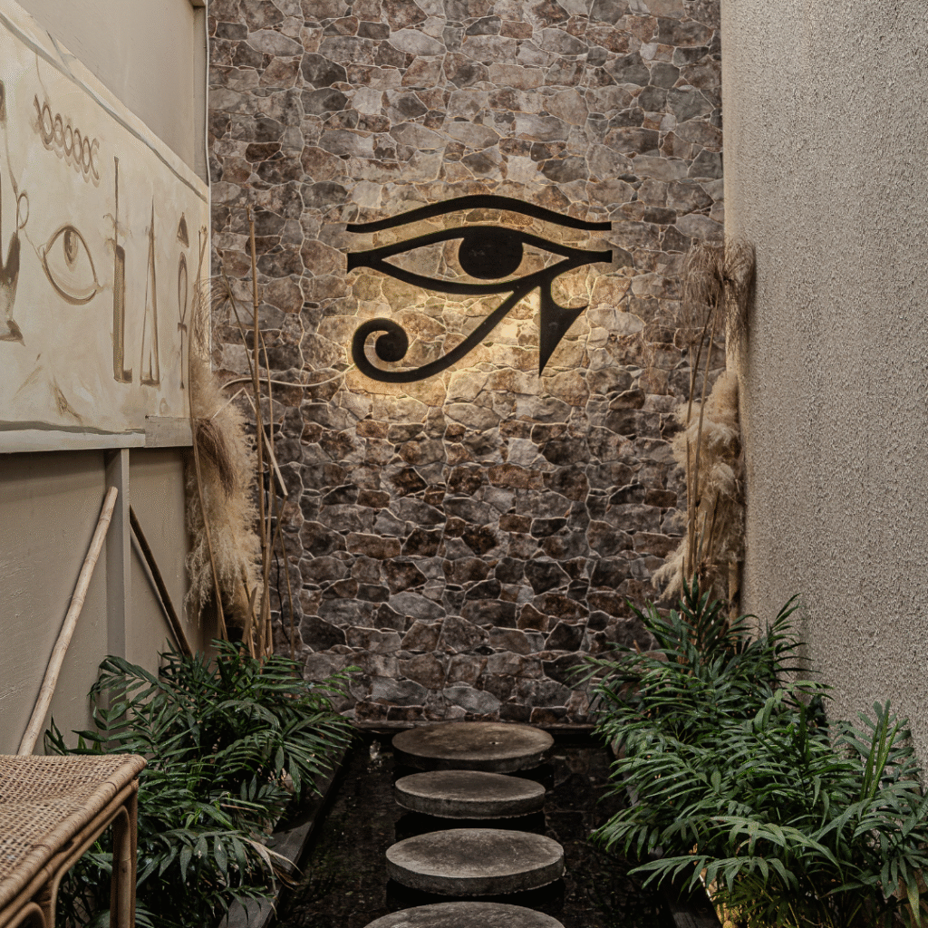 Desde el diseño de ambientes se trabajó minuciosamente en la selección de elementos decorativos, texturas y mobiliario que reforzaran la identidad visual del local. Se incorporaron materiales nobles y cálidos, con una paleta de colores que evoca la tierra, el oro y la espiritualidad del desierto egipcio. Las luminarias cálidas fueron clave para generar una atmósfera tranquila, elegante y envolvente, fomentando una experiencia sensorial de relajo para los clientes.