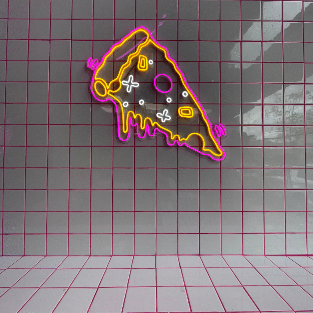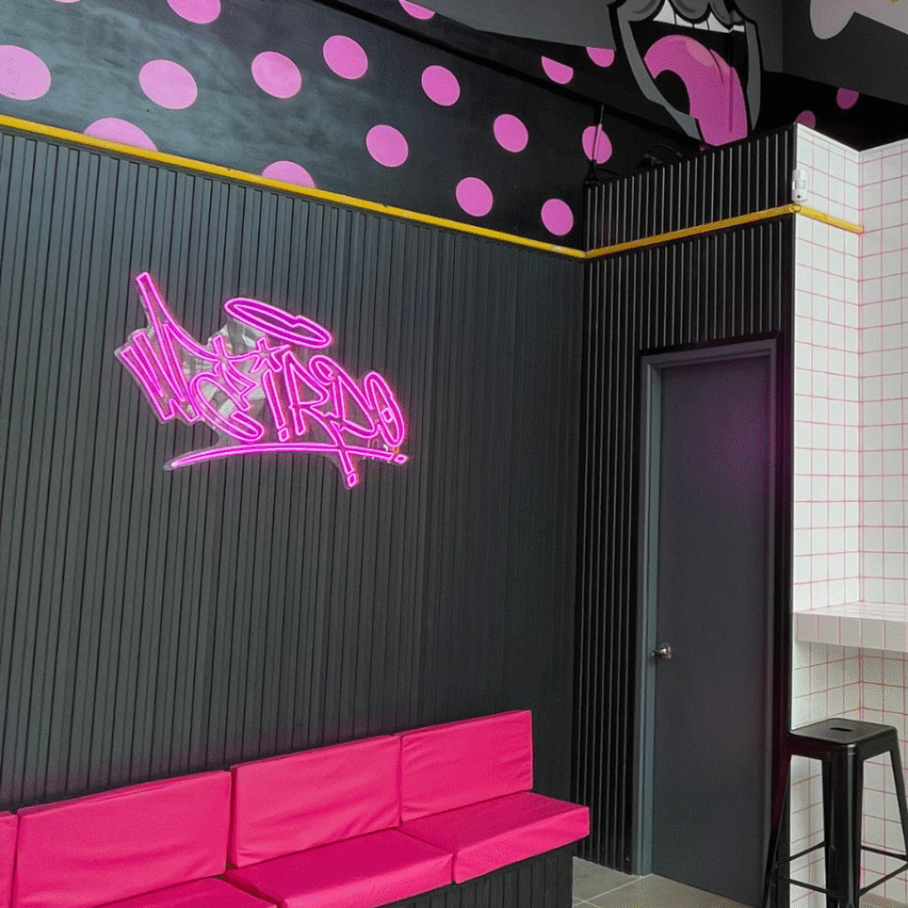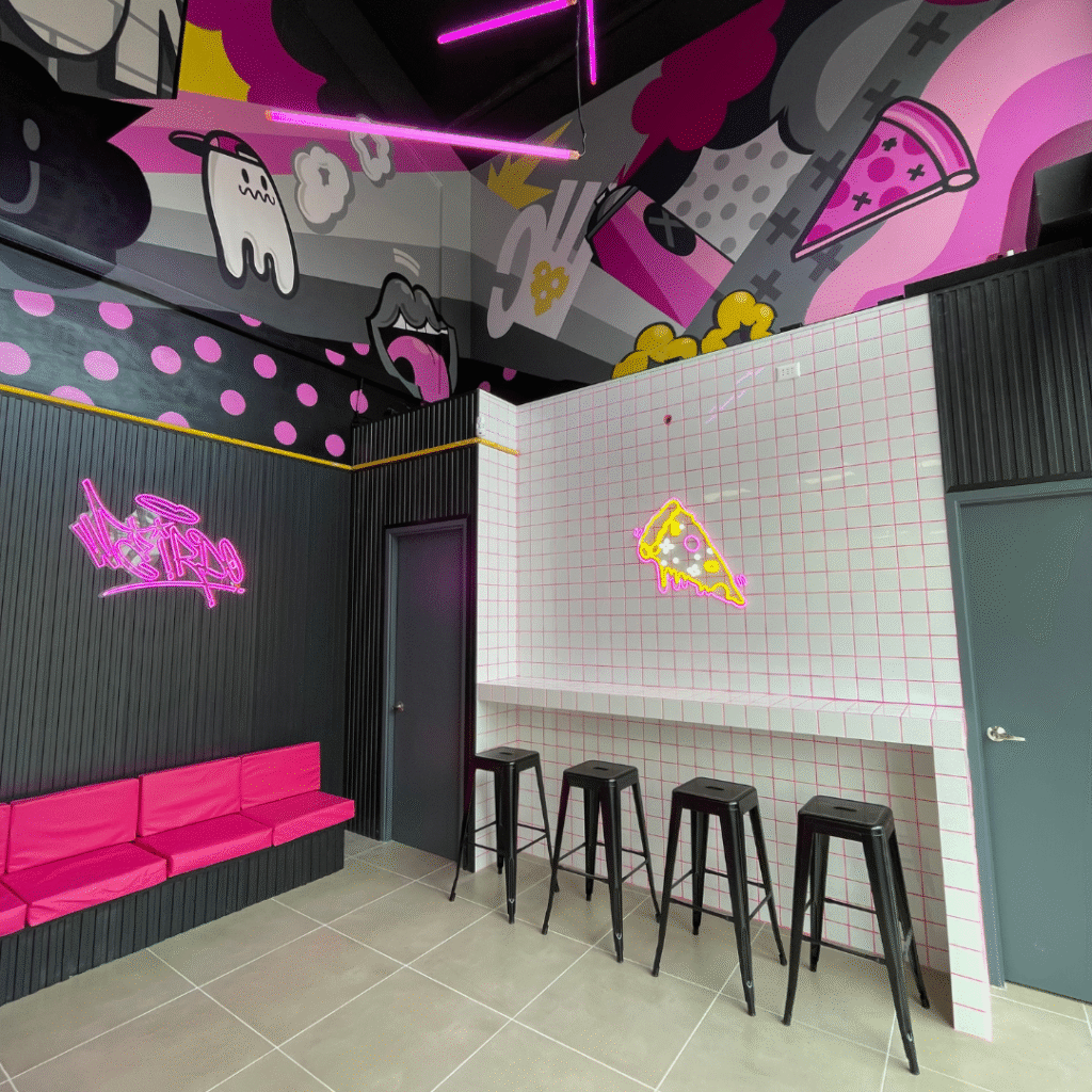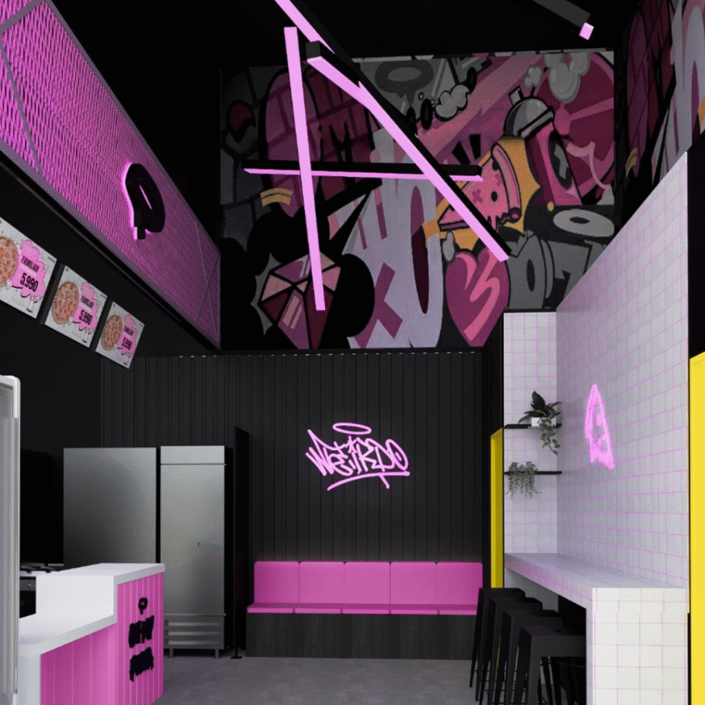 Se definió un sector específico para la atención al cliente y el consumo rápido, pensado como un espacio cómodo y práctico. En esta zona, el diseño incorporó un cielo de doble altura que, junto con el uso de diferentes materialidades, realza la percepción del espacio y otorga mayor visibilidad desde el exterior. Todo esto se trabajó bajo una identidad de marca juvenil, con un estilo urbano- industrial que refuerza el carácter fresco y contemporáneo del local, logrando una fachada atractiva y llamativa que invita a entrar.